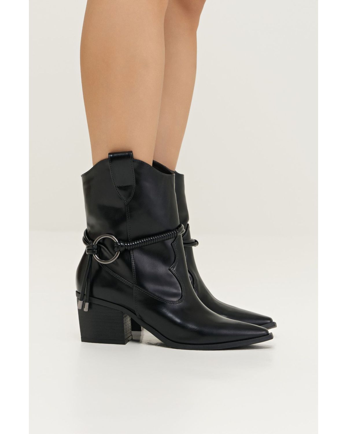 A Bota Western Preta traduz atitude e sofisticação em uma leitura contemporânea do estilo clássico. Confeccionada em material sintético com acabamento liso, a peça apresenta design marcante com bico levemente alongado e salto bloco que garante estabilidade e elegância. O destaque fica por conta do detalhe lateral com fivela e argola metálica, que adiciona personalidade e um toque urbano ao visual. Versátil e atemporal, é uma bota que transita com facilidade entre produções casuais e composições mais elaboradas.