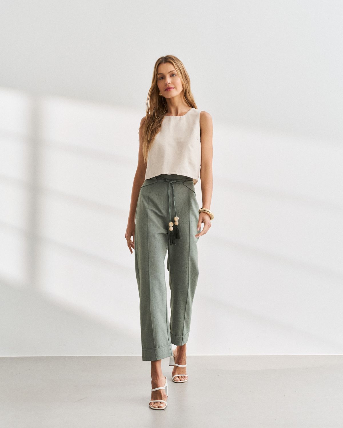 A Calça Cropped Luna traduz a elegância natural em uma peça leve, versátil e contemporânea. Confeccionada em tecido com toque macio e aspecto de linho, apresenta caimento confortável e sofisticado, ideal para o dia a dia. Com modelagem reta e levemente solta, valoriza a silhueta com naturalidade. A cintura média com amarração e delicados pingentes adiciona charme artesanal ao visual, enquanto os bolsos laterais e a barra dobrada trazem um toque moderno e funcional. Versátil e atemporal, é uma peça que transita com facilidade entre produções casuais e composições mais elegantes. DETALHES DO PRODUTO Calça cropped com toque de linho Modelagem reta e levemente solta Cintura média com amarração Pingentes decorativos no cós Bolsos laterais funcionais Barra dobrada DICAS DE STYLING Combine com regatas ou blusas leves para um look casual sofisticado. Use com camisas ou blazers para uma proposta mais elegante. Aposte em sandálias ou flats para um visual moderno e confortável. Finalize com acessórios naturais para reforçar a estética leve da peça.