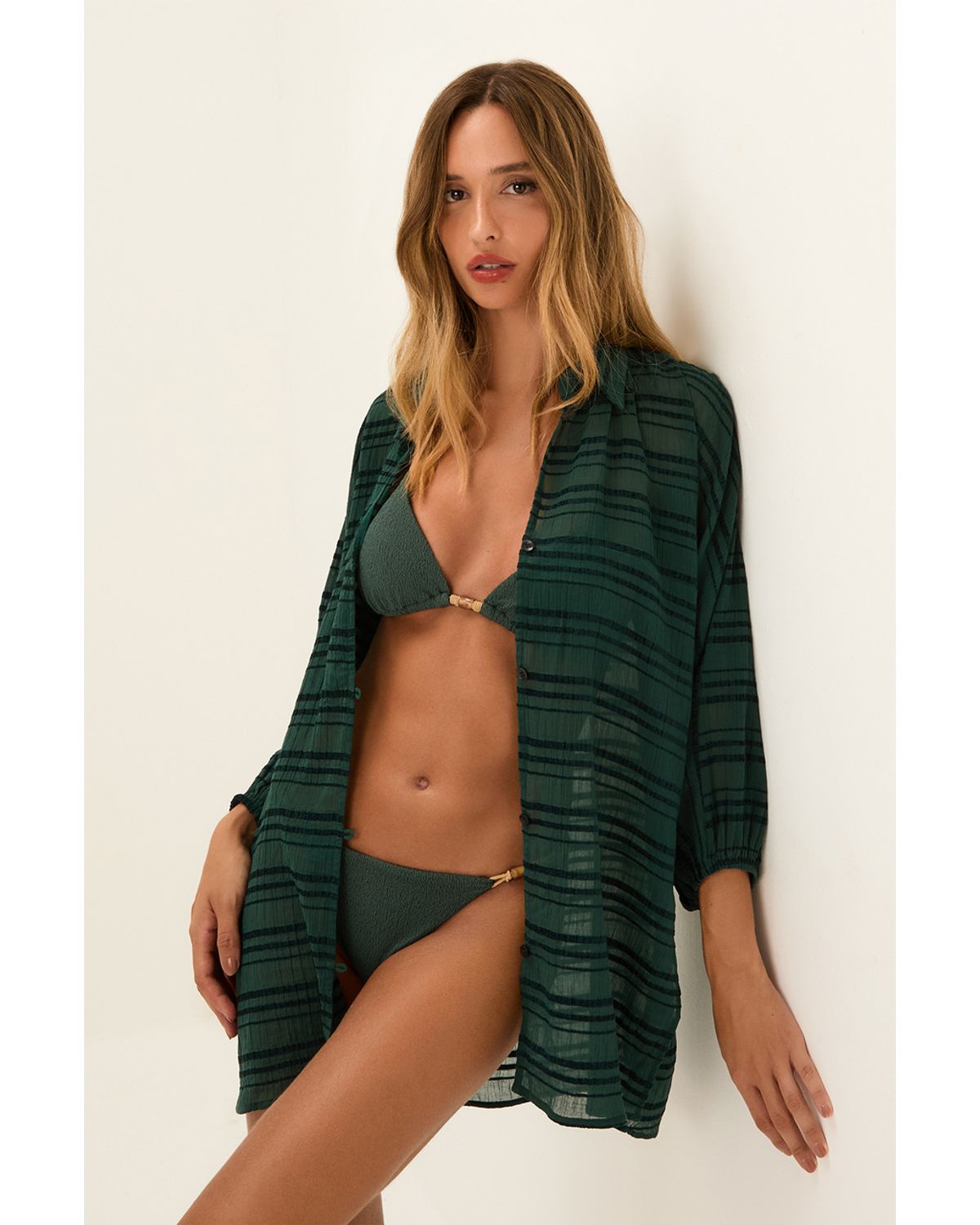 Para usar por muitas temporadas, a camisa verde Jenna é feita em algodão texturizado em modelo fluído que destaca a peça. O botão frontal, quando fechado, forma um decote em V, enquanto as mangas compridas com elástico nos punhos garantem conforto e praticidade. Uma escolha versátil para diferentes ocasiões.