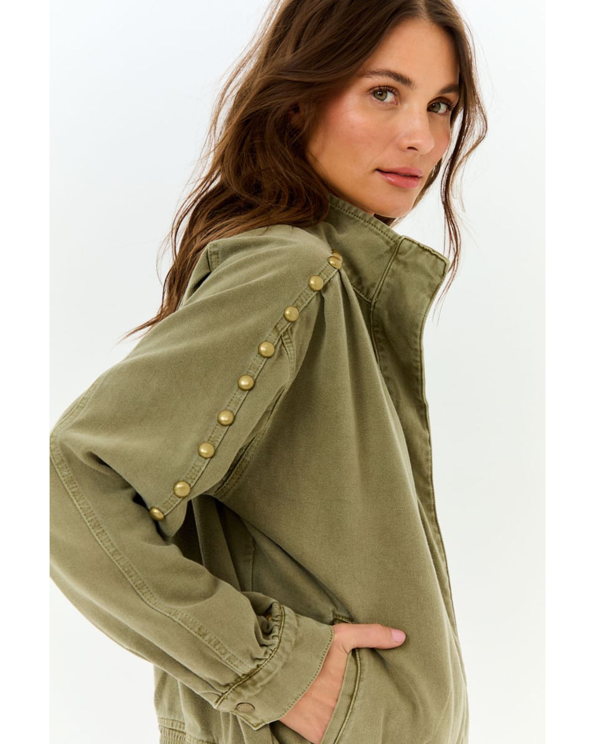 A Jaqueta Sarja Oversize com Pregas e Tachas traduz uma estética utilitária com toque contemporâneo, combinando atitude e sofisticação em uma peça statement. Em tom verde militar, traz personalidade ao look com detalhes marcantes e acabamento refinado. A modelagem oversize confere um caimento amplo e confortável, enquanto as pregas estruturadas adicionam volume e movimento à silhueta. O destaque fica por conta das tachas metálicas aplicadas ao longo das mangas, que introduzem um elemento moderno e autêntico. Confeccionada em sarja de algodão, a peça oferece estrutura na medida certa com toque macio, tornando-se ideal para sobreposições em diferentes estações.