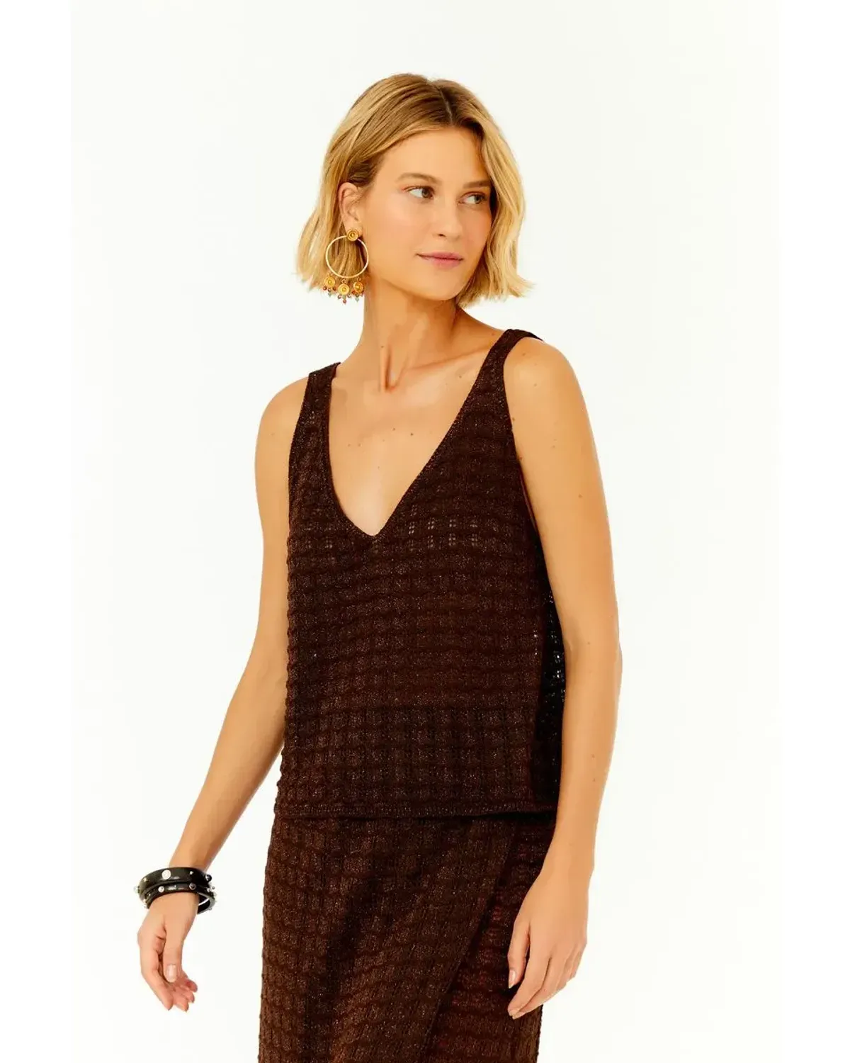 A Regata Tricot Telada Cropped traduz modernidade e textura em uma peça curinga para diferentes estações. Produzida em acrílico e viscose, apresenta estrutura encorpada e confortável, com efeito telado que garante respiro e leve transparência sofisticada. O design cropped valoriza a silhueta, enquanto a gola V na frente e atrás cria alongamento visual e versatilidade. O detalhe de pequenos babados sutis adiciona feminilidade delicada. Atemporal e atual, é ideal para composições que transitam entre o casual e o elegante com naturalidade.