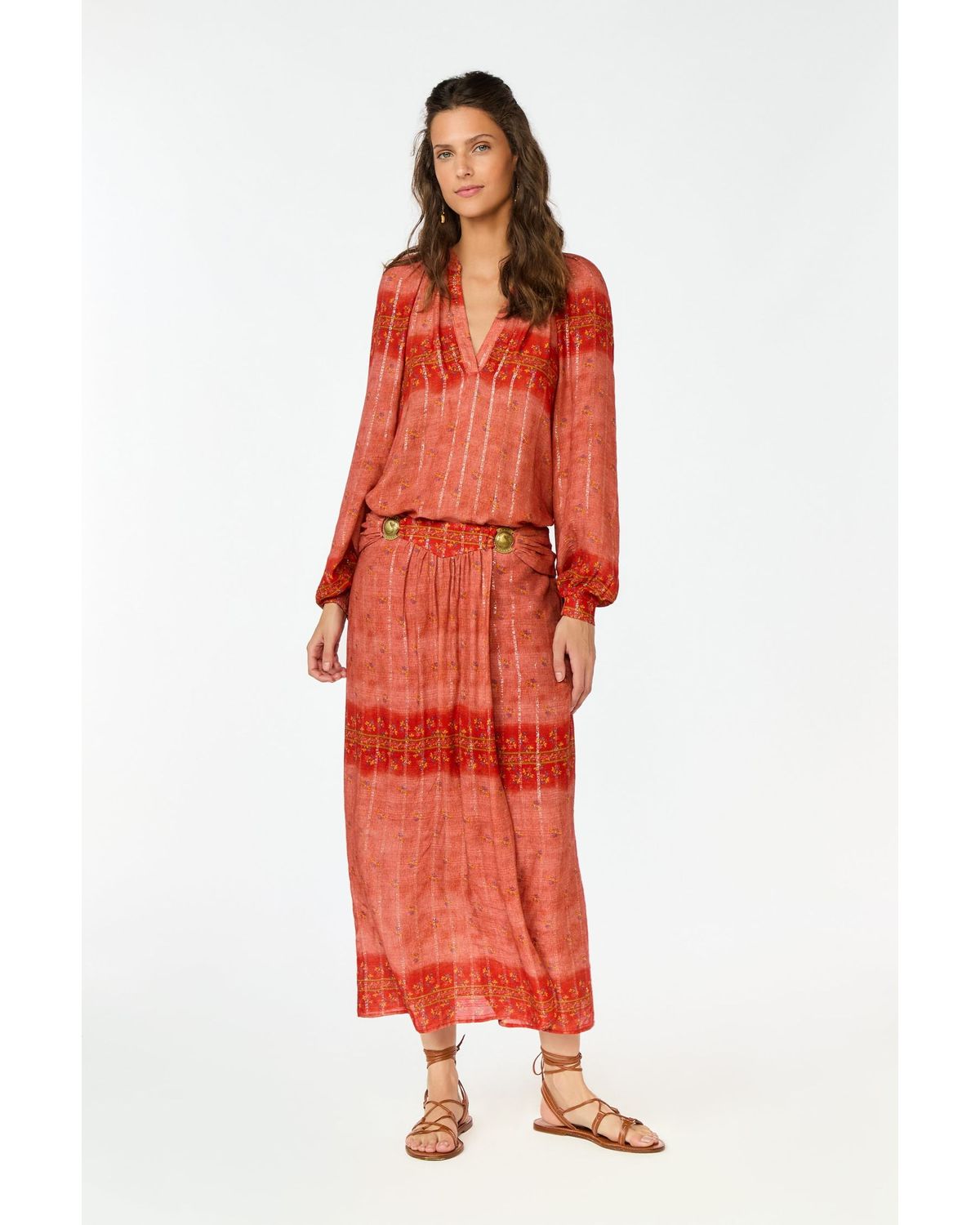 A Saia Midi Estampa Laguna é uma peça que traduz o charme natural do verão em um visual leve e sofisticado. Confeccionada em viscose com leve toque de poliéster, tem caimento fluido e textura suave, valorizando o movimento a cada passo. A estampa com barrado em tons quentes e detalhes de lurex reflete o espírito solar da temporada. O modelo traz drapeado frontal que cria volume delicado, forro interno para conforto e fecho invisível nas costas — uma combinação perfeita entre elegância e praticidade.