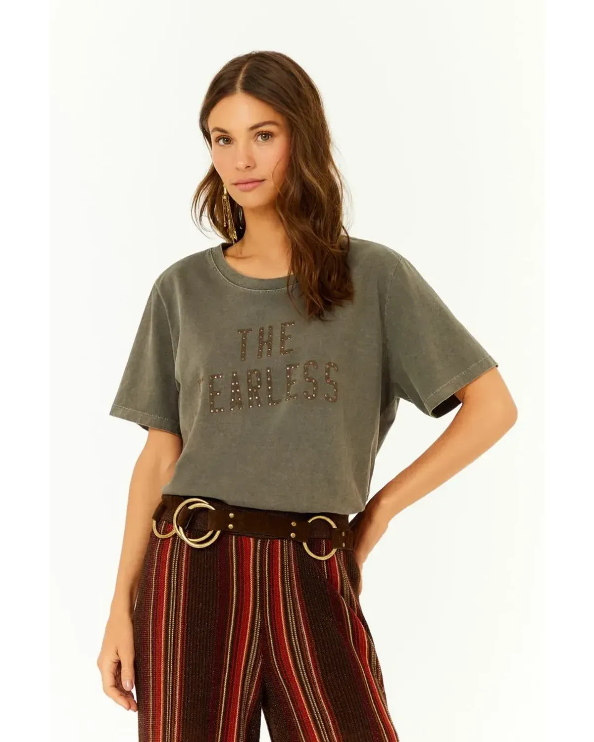 A T-Shirt The Fearless é a união entre o básico atemporal e o detalhe marcante. Confeccionada em 100% algodão, possui toque macio, estrutura encorpada e leveza para acompanhar o dia a dia com conforto. A modelagem ampla proporciona movimento, enquanto o design minimalista ganha protagonismo na inscrição feita com paetês na altura do busto, que traz personalidade e originalidade à peça. Atemporal e versátil, é uma t-shirt feminina de algodão que se transforma em curinga para diferentes ocasiões, seja em produções casuais ou para criar contraste em combinações mais sofisticadas. Seu caimento garante frescor, mantendo o equilíbrio entre praticidade e estilo autoral.