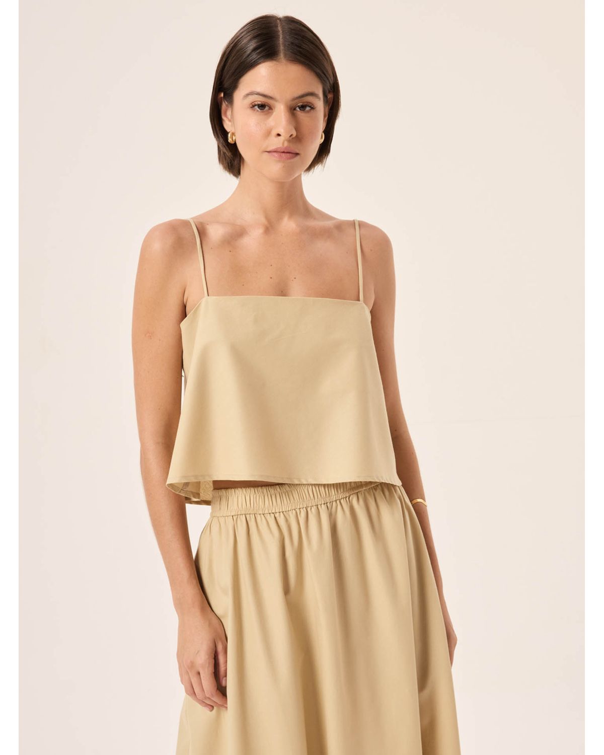 Top decote reto com shape evasê, alça fina rolotê e amarração ajustável nas costas. Tamanho P veste PP e P. Tamanho M veste M e G.