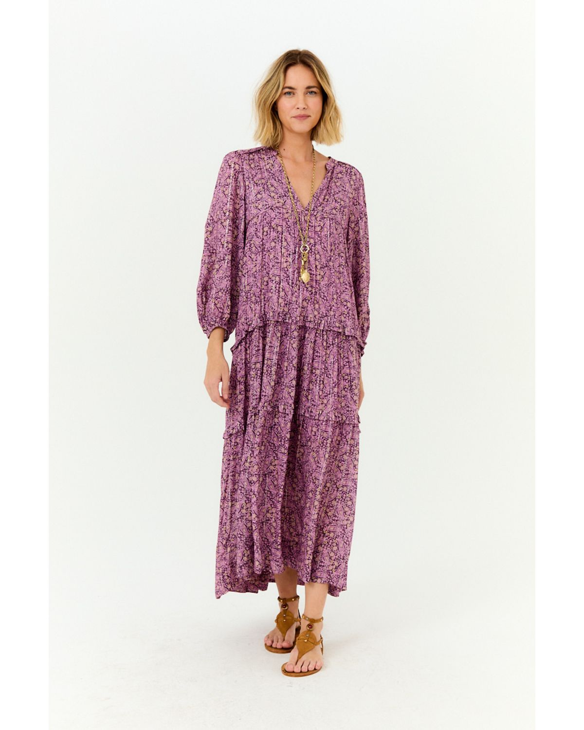 O Vestido Manga e Babado Estampa Aysha traz uma leitura feminina e fluida para o dia a dia, com estampa delicada e construção leve que valoriza o movimento do corpo com naturalidade. Sua modelagem ampla proporciona conforto e elegância sem esforço, enquanto as mangas longas levemente volumosas adicionam sofisticação ao visual. Os recortes com babados ao longo da saia criam movimento e suavidade, trazendo leveza à silhueta. O decote em V alonga a linha do colo e equilibra a composição, reforçando a estética delicada e atemporal da peça. Versátil, é ideal para produções que transitam do dia para a noite com facilidade. Assinado pela Maria Filó, marca reconhecida pelo estilo feminino, leve e autêntico, o modelo traduz charme, fluidez e um olhar delicado sobre o vestir.