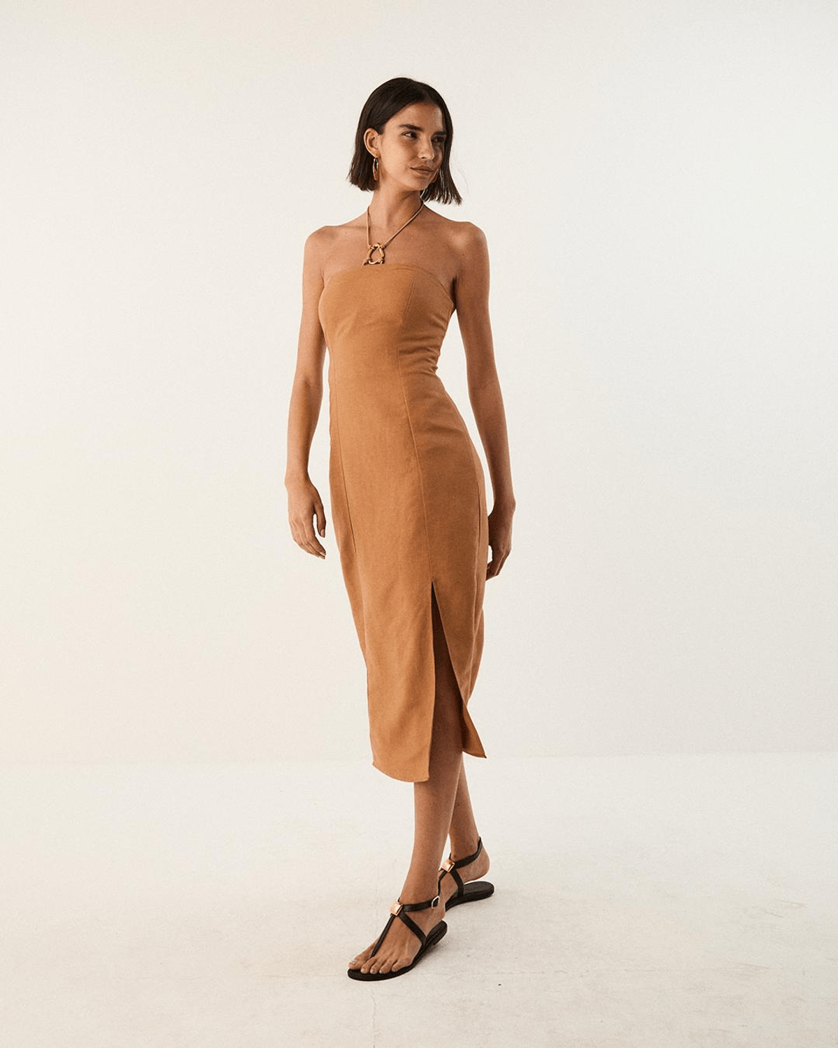 O Vestido Midi Amora Detalhe Toffee valoriza a silhueta com um design sofisticado e naturalmente elegante. Sua modelagem tomara-que-caia traz um visual moderno e feminino, destacando o colo com delicadeza. Os recortes estratégicos e a fenda frontal adicionam movimento e leveza à peça, enquanto o detalhe em metal orgânico dourado, aliado à amarração no pescoço com corda elástica, cria um ponto de destaque refinado e contemporâneo. Com zíper nas costas, forro interno e lastex para melhor ajuste, o vestido oferece conforto e segurança ao vestir. Confeccionado em tecido Melbourne, de fibras naturais e leve estrutura, garante um caimento elegante e sofisticado. Assinado pela ViX Paula Hermanny, marca reconhecida pela sofisticação e pelo lifestyle praiano contemporâneo, o modelo traduz design autoral, elegância e versatilidade. Ideal para diferentes ocasiões, pode ser usado com sandálias flats em produções mais casuais ou com salto médio para composições mais elegantes.